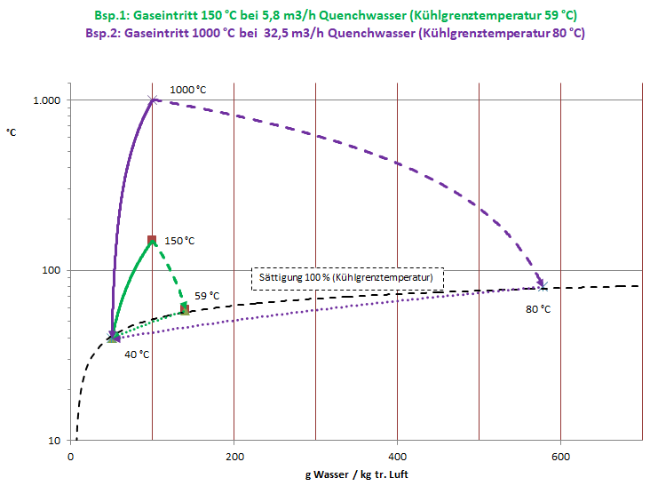 Ein typischer Anwendungsfall: Ein Heißgasstrom mit 150 °C (Beispiel 1, siehe Grafik) bzw. 1.000 °C (Beispiel 2, siehe Grafik) und einem Massenstrom von 1.100 kg/h (Wasseranteil 0,1 kg pro kg trockener Luft) wird mit 30 °C warmem Quenchwasser gezielt auf eine Gasaustrittstemperatur von nur 40 °C unterkühlt, ein Paradebeispiel für gezielte Prozessführung mit höchster Effizienz.
