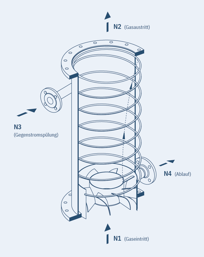 Körting Drall-Tropfenabscheider werden im Abscheideraum als Wendelrohr ausgelegt. Diese besondere Bauart verhindert einen Transport des an der Wand entstehenden Flüssigkeitsfilms in Richtung der Gasaustrittsöffnung. Der Fluss der abgeschiedenen Tropfen wird durch die Schleppkraft des Gases nicht beeinflusst. Dabei läuft die Flüssigkeit nicht in der Drehrichtung des Gases aufwärts, sondern abwärts. Erzielt wird dieser Effekt durch die besondere Profilierung und Anordnung der „Wendel", die in der Drehrichtung des Gases abwärts führen. In der Höhe des Drallerzeugers wird die Flüssigkeit aufgefangen und abgeleitet.