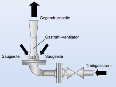 Gasstrahl-Ventilatoren sorgen mit einem gasförmigen Treibmedium für die Absaugung eines großen Gasvolumenstromes. Der große Gasvolumenstrom kann bei einem Gasstrahl-Ventilator erreicht werden, weil nur geringe Druckdifferenzen zu überwinden sind.