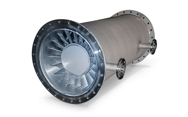 The separation chambers in Körting swirl droplet separators are designed as helically coiled tubes. This special design prevents the liquid film that forms on the tube wall from being conveyed to the gas outlet. The drag force of the gas has no impact on the separated droplets’ flow. The liquid doesn’t flow in the direction the gas rotates in, but downwards. This effect is achieved by the special profiles and layout of the helically coiled tubes that lead downwards towards the direction the gas rotates in. The liquid is collected and removed near the swirl generator.