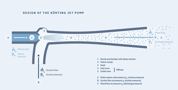 The achievable pressure gain is a function of the ratio of the quantity of the suction medium/gas volume flow entering the jet ejector/jet scrubber to the motive flow used and its pressure (motive pressure). More motive medium and more motive pressure always increase the pressure gain.