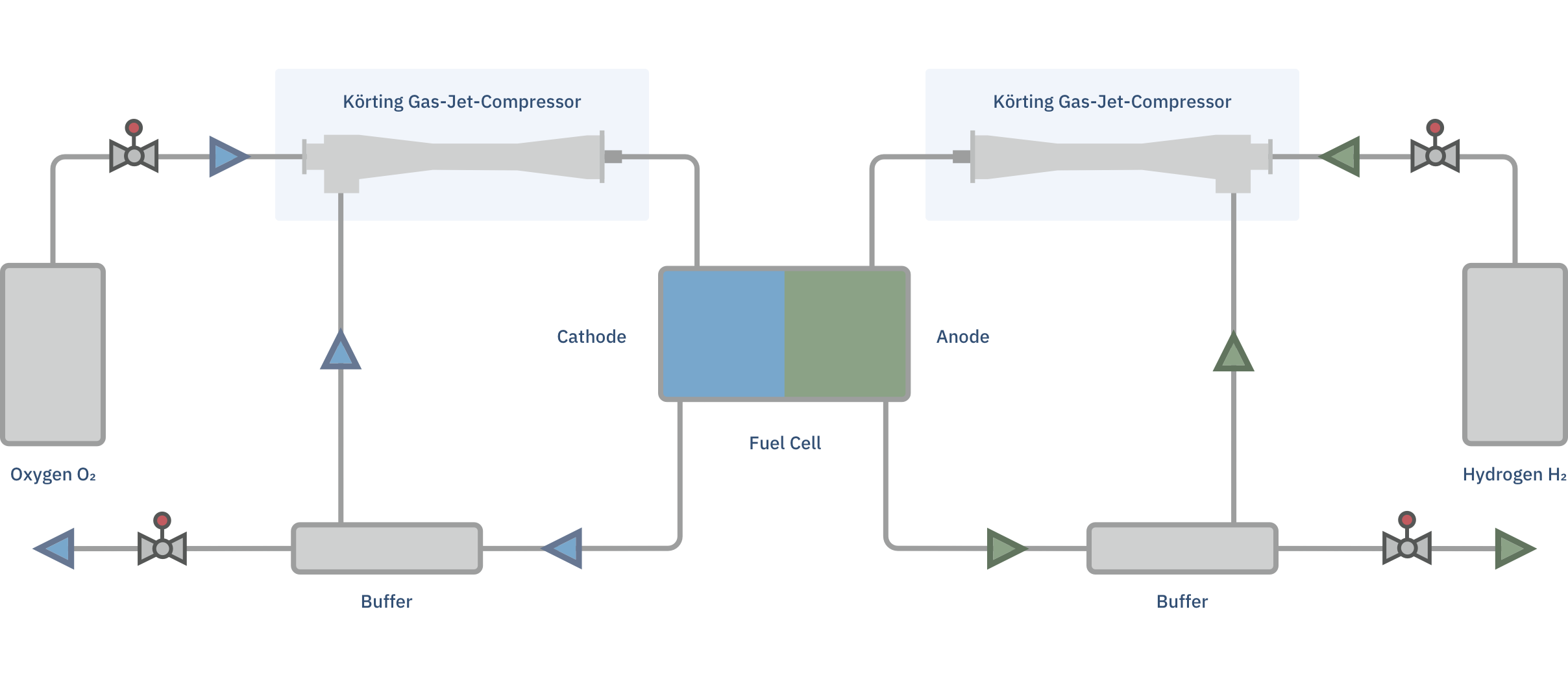 Jet ejectors are a good alternative to electrical circulation blowers. Jet ejectors function on the Venturi principle and use the hydrogen’s operating pressure downstream of the hydrogen tank as motive pressure to suck in and recirculate the unused hydrogen. In contrast to circulation blowers, jet ejectors have no moving parts or extra power supply. As a result, service lives are longer and maintenance, repair and energy costs minimised.