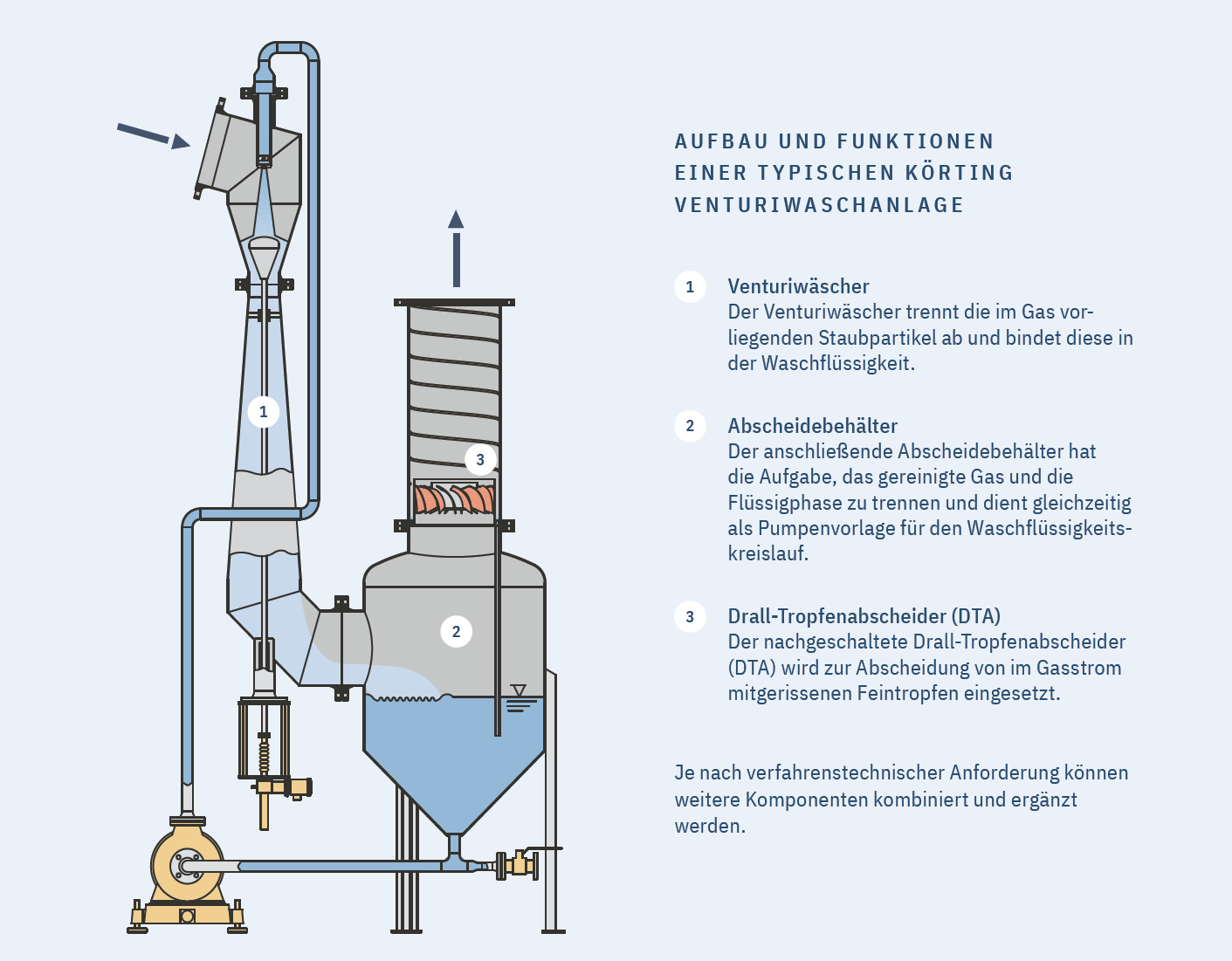 Venturiwäscher kommen ohne drehende oder mechanisch bewegliche Bauteile aus. Sie zeichnen sich durch: