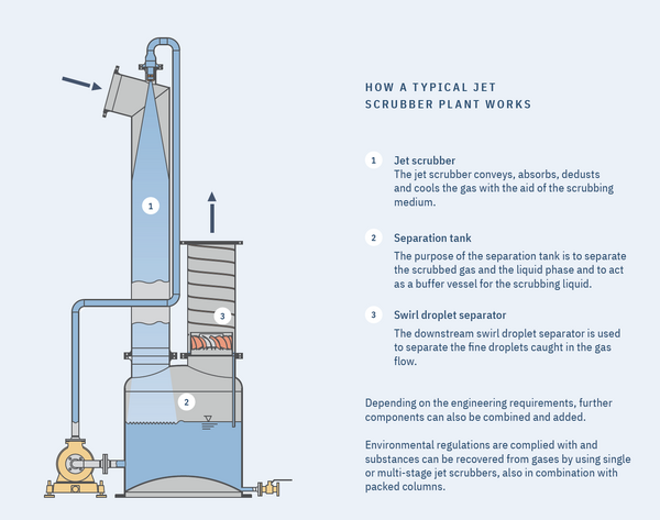 Jet scrubbers are also often called jet gas scrubbers. Jet scrubbers are gas scrubbers and often used in combination with a column, demister, or swirl droplet separator.