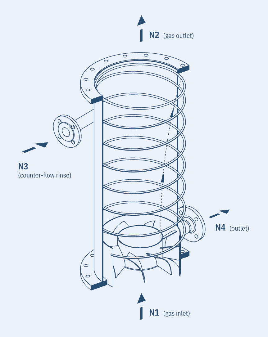 The design also makes cleaning the inside of the helically coiled tube during operation easier. In complex applications special additional rinsing systems effectively help to prevent deposits on the separator and on the swirl generator’s vanes. This type is frequently required for challenging products where adhesion is a problem. Rinsing systems can be used while the machinery is in operation without generating new droplets in the cleaned gas.